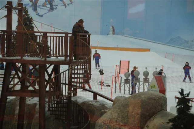 We next went by for a look at the indoor ski slopes that most of you have seen in pictures before. I attach a couple of pictures of the “kluge track”, the ice sculptures that were everywhere inside and a skier or two.